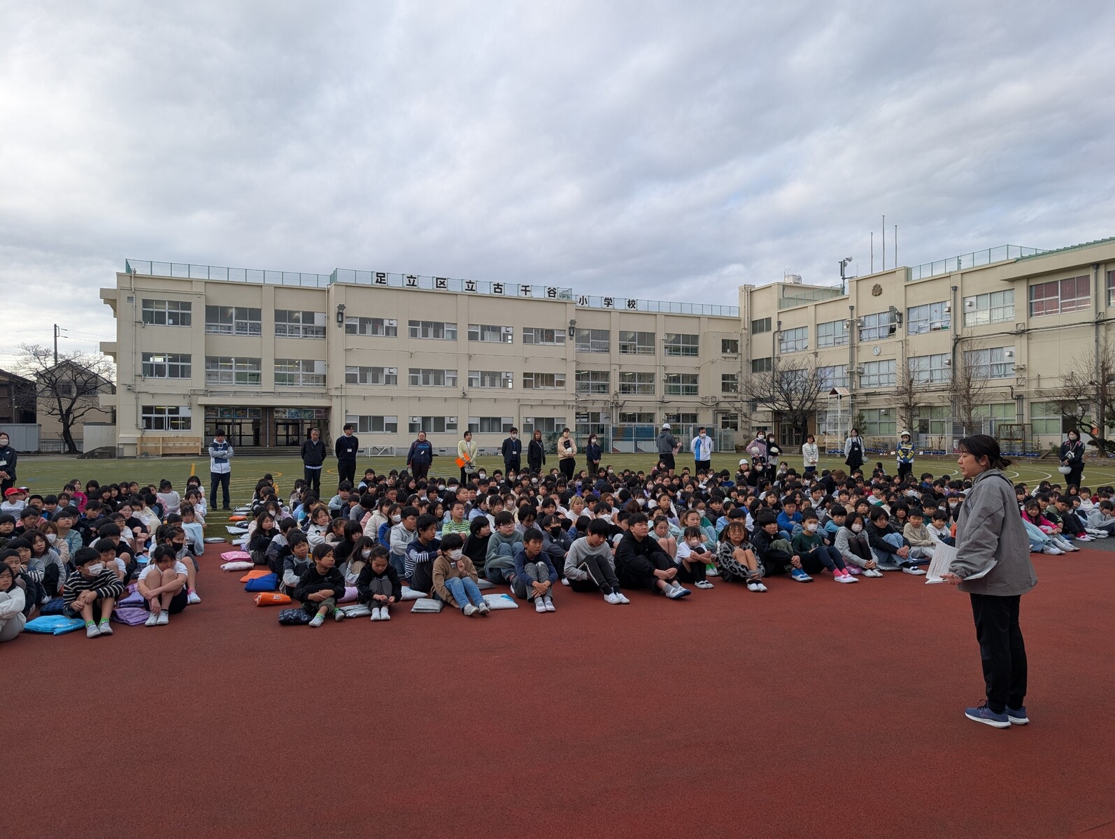 突然の放送にもかかわらず、児童たちは静かに、そして迅速に行動することができました。訓練後、薄着の児童に「寒くなかった?」と尋ねると、「寒かったけど、がんばった」と頼もしい返事がありました。