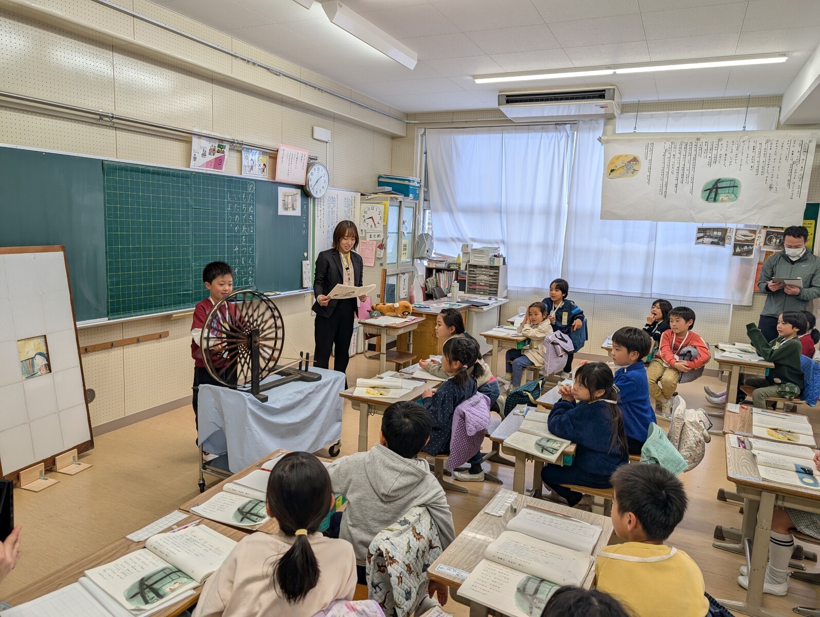 国語の「たぬきの糸車」の学習では、登場するたぬきの気持ちを考える活動を行いました。子供たちは、たぬきになりきって楽しそうに動作を交えながら発表しており、物語に深く親しんでいる姿が印象的でした。